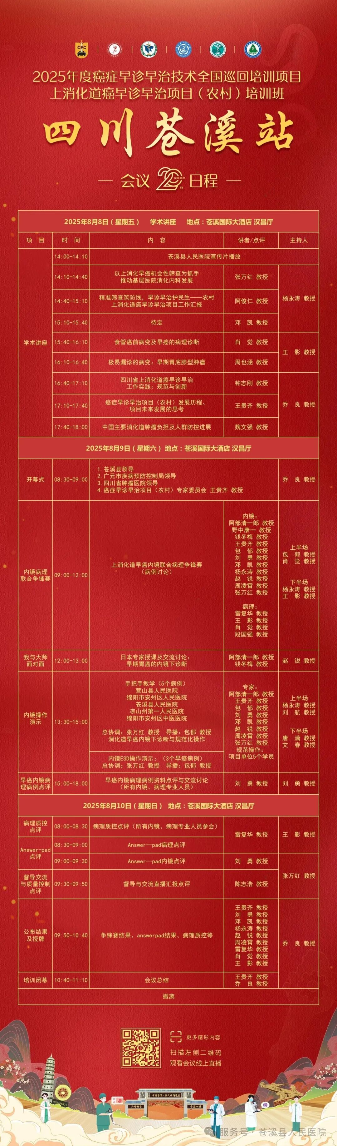 国内外专家齐聚苍溪!2025年度癌症早诊早治技术全国巡回培训项目(四川苍溪站)即将启幕发表时间:2025-08-01 15:00 为扎实推进2025年度农村地区上消化道癌早诊早治项目,提升基层医疗机构专业技术人员的业务能力与技术水平,根据全国项目培训计划安排,由中国癌症基金会、癌症早诊早治项目(农村)专家委员会与四川省疾病预防控制局、四川省肿瘤医院(四川省癌症防治中心.电子科技大学附属肿瘤医院、重庆大学附属肿瘤医院、青海大学附属医院、西藏自治区人民医院及苍溪县人民医院共同主办的“癌症早诊早治技术全国巡回培训——上消化道癌早诊早治(农村)培训班(四川苍溪站)”,定于2025年8月8日-10日正式举办。 本次培训精准聚焦上消化道癌防治的核心难点,特别邀国内外肿瘤防控、消化内科、内镜诊疗、病理诊断等领域的权威专家参会,培训内容紧扣查策略制定、规范化内镜诊疗、精准病理诊断等核心环节,通过专题讲座、典型病例深度研讨、手把手带教、手术演示等多样化形式,全方位助力基层医护人员提升早诊早治实战能力。 早诊早治是癌症防控的“关键一招”。此次苍溪站培训将为基层搭建高质量交流平台,进一步推动农村地区上消化道癌防治工作向规范化、精细化深化,为守护群众健康筑牢防线。 期待与各位同仁齐聚苍溪,共研防治技术,共护百姓安康!